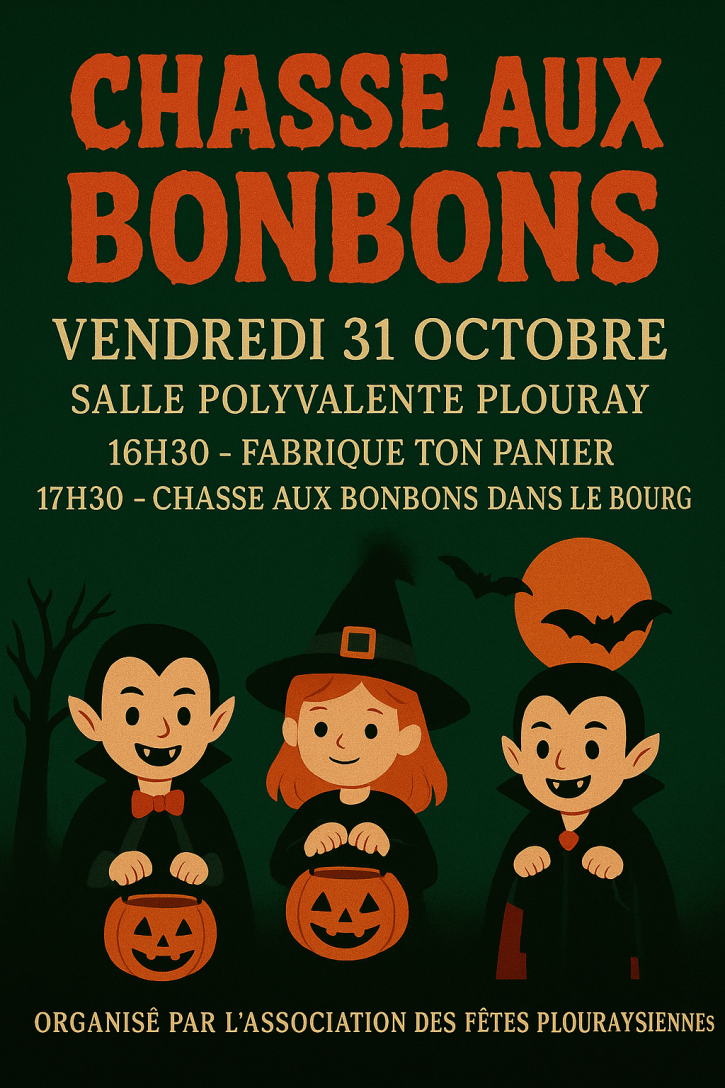 Chers enfants, n'ayez pas peur et venez préparer la chasse aux bonbons. Pour ce faire, l'Association des fêtes Plouraysiennes vous propose un atelier de fabrication de sacs à bonbons pour ensuite vous en servir lors du défilé dans les rues Plouraysiennes. N'hésitez pas à venir petits monstres... cela promets d'être monstrueusement bien !