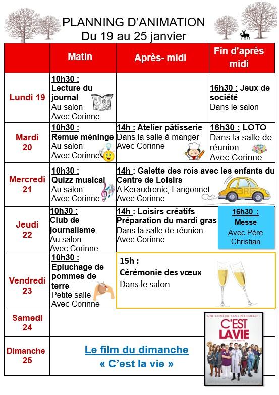 Vendredi 23 janvier: cérémonie des vœux (Mr Morvant- Président du CCAS et Maire de Plouray et Mme Gloret auront le plaisir de présenter leurs meilleurs vœux pour cette nouvelle année et de partager avec les résidents un moment de convivialité autour d'un gouter)