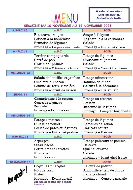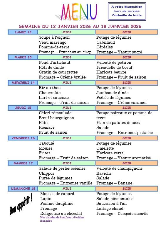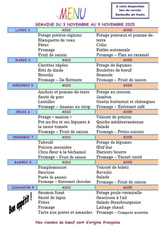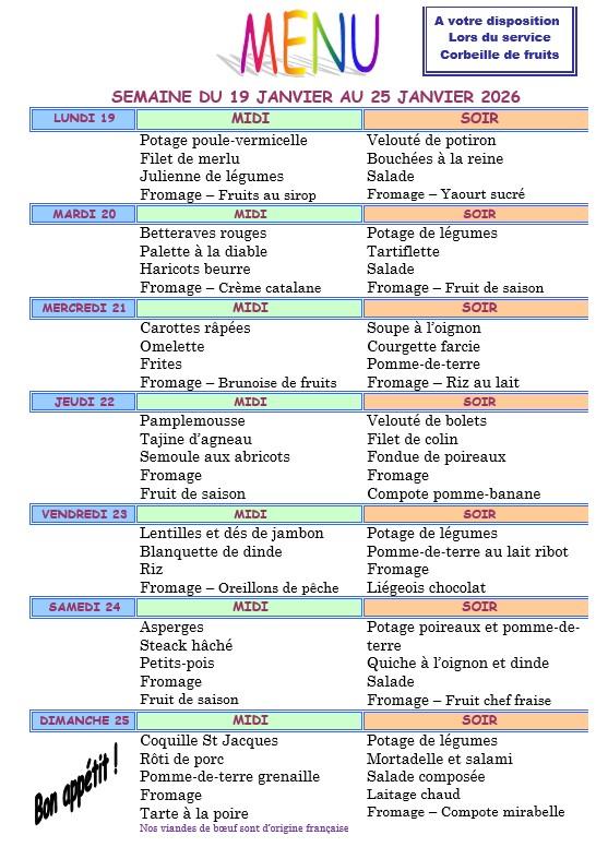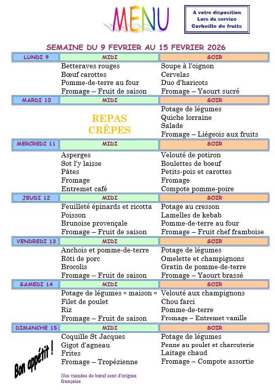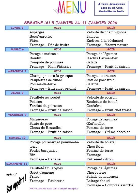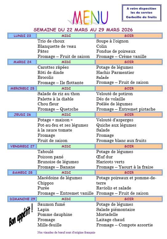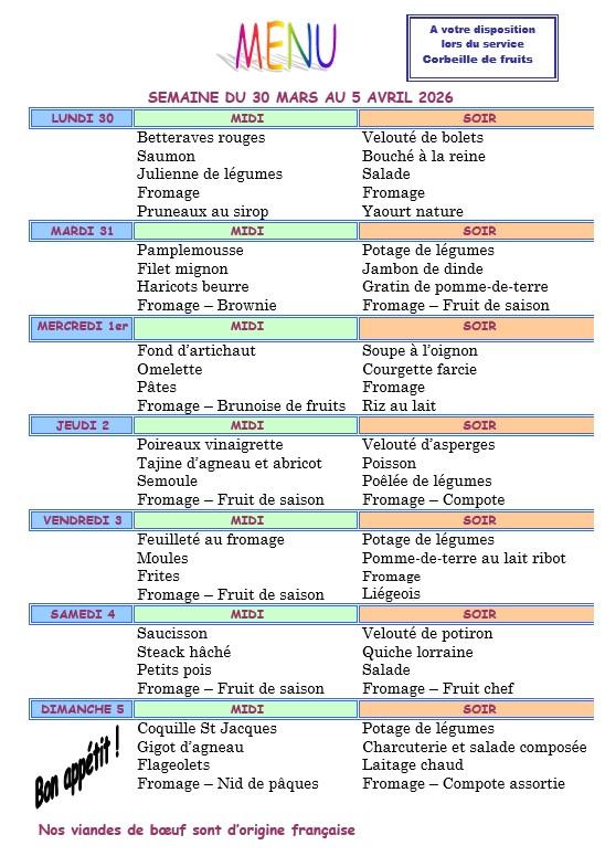 Vous trouverez ci dessous les menus proposés aux résidents chaque semaine.